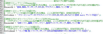 (任意)左画像の(設定11)(設定11-2)は、リンク集トップ(=新着)ページの<head>内のmetaタグに記入されます。 同様に(設定12)(設定12-2)は、リンク集1以降のページの<head>内に記入されます。 SEOの観点から、そのページに多く出現するKEYWORDを中心に記入されるといいでしょう。 (例)サーチ,アクセスアップ・・・など |