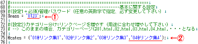 (必須)左画像@の $pass = '0123'; の 0123 の部分だけを任意の英数字で書き換えて下さい。これは、管理室に入る時のパスワードになります。 (任意)後にリンクページを増設される場合、左画像Aの下線部の後ろに ,05@リンク集5' と言う様に記入し「settei.cgi」をアップ→管理室にて「更新」されると自動的にページが作成されます。 |